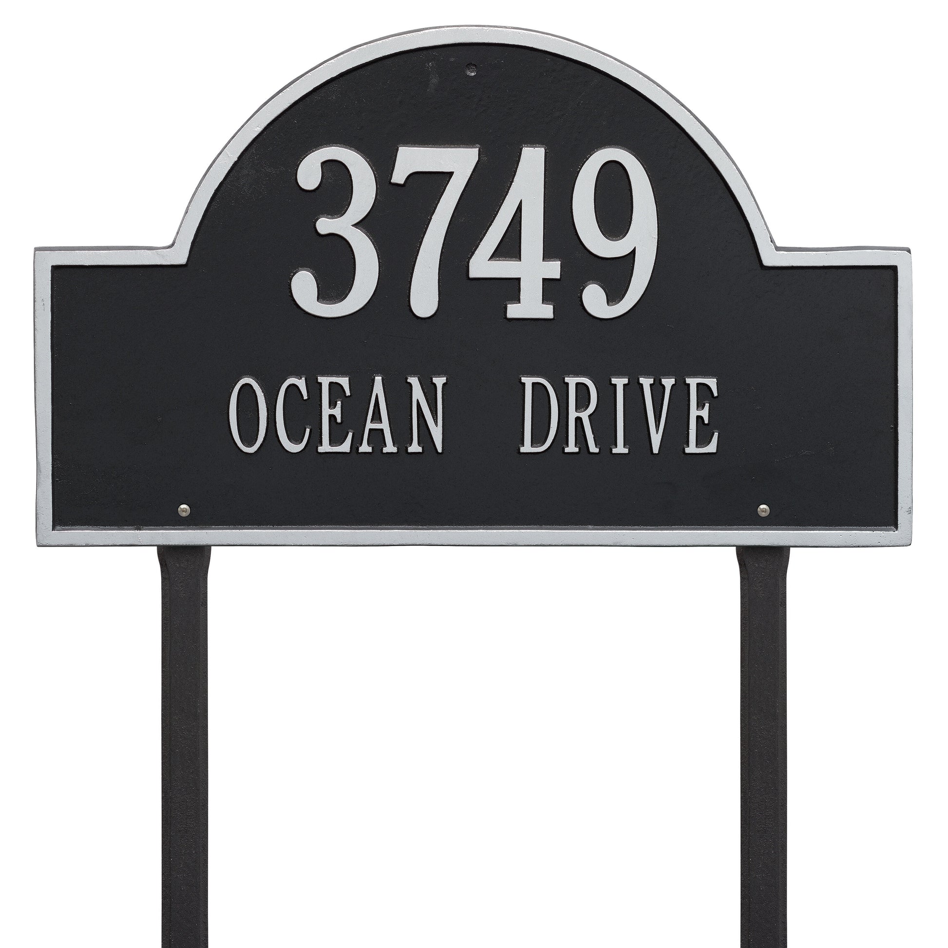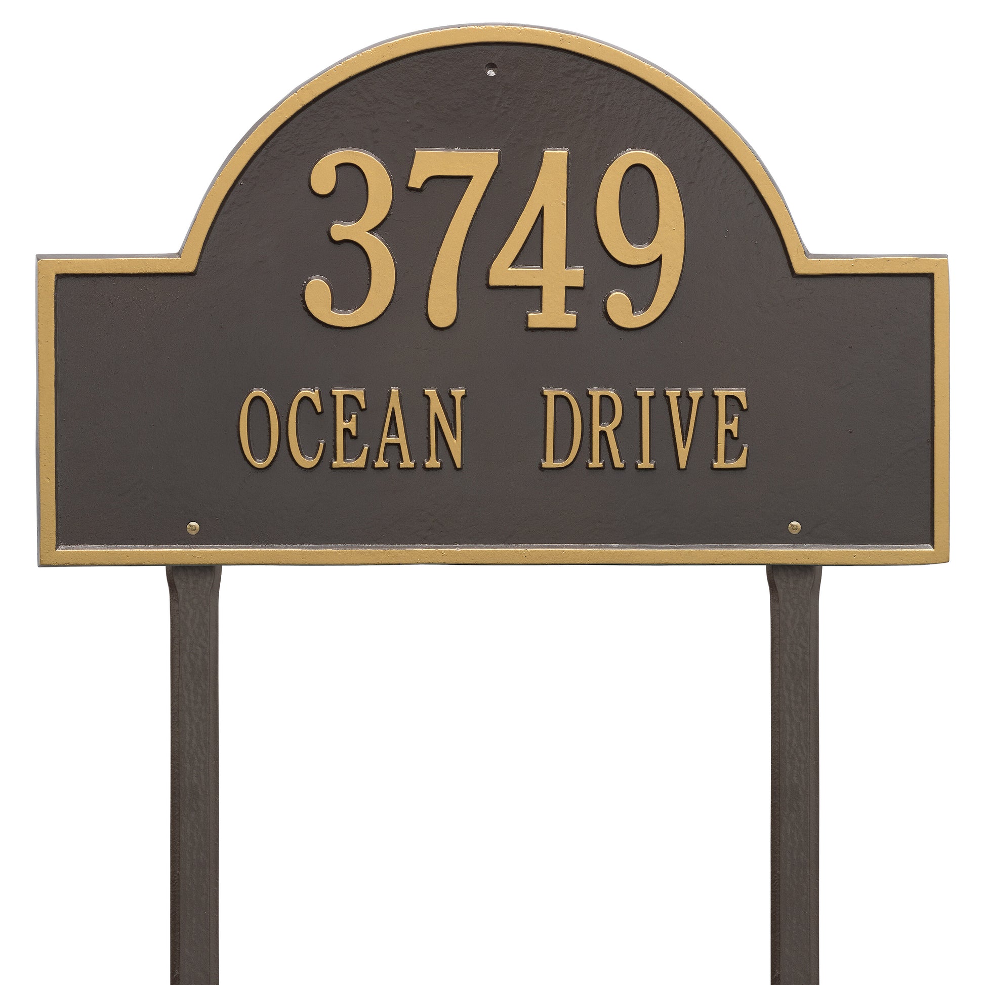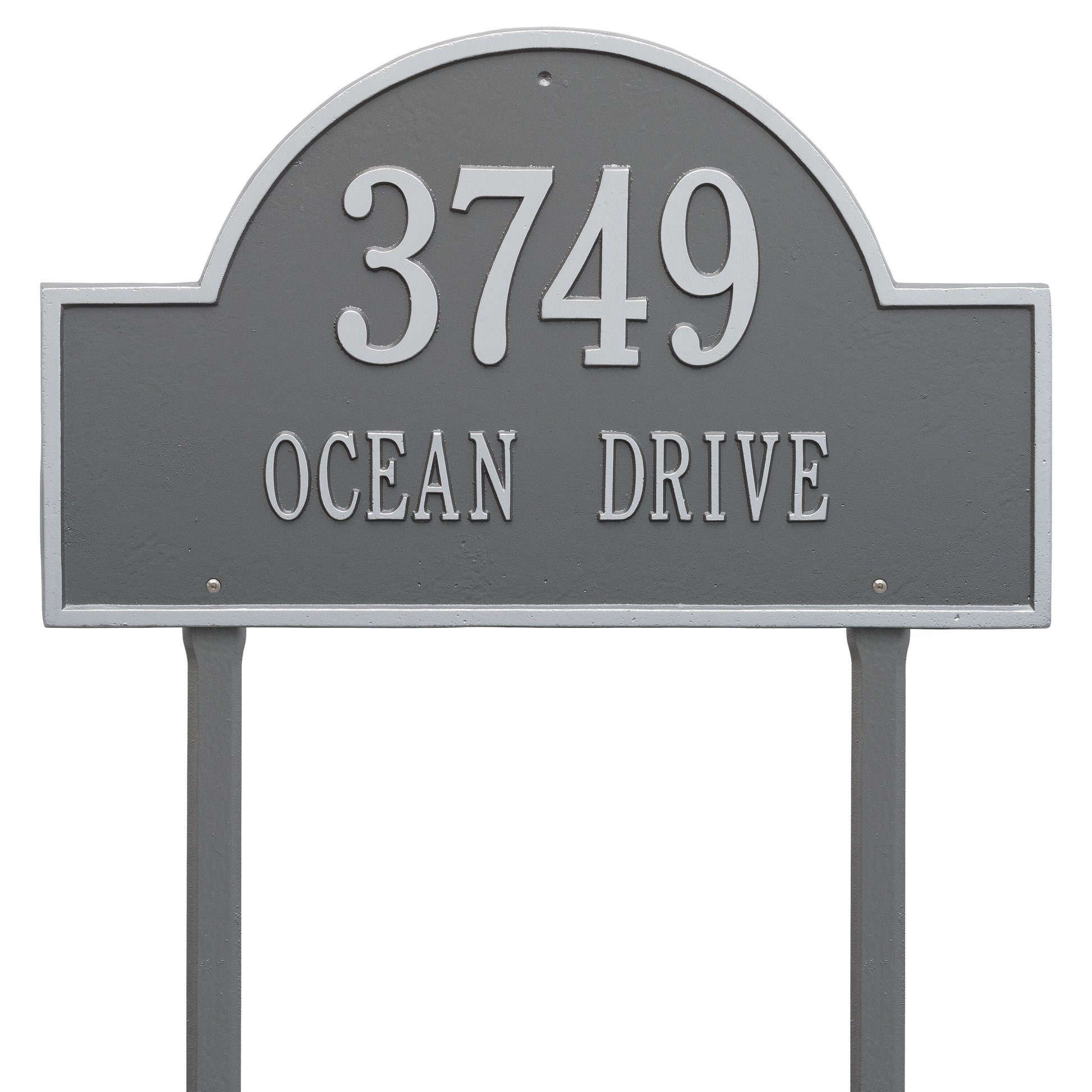 The Arch Marker - Estate Lawn - Two Line Address Plaque is proudly crafted in the USA using premium, rust-proof cast aluminum, ensuring your investment will withstand the elements for years to come. This plaque undergoes a meticulous finishing process, featuring a weather-resistant coating and permanently cast, raised lettering for unparalleled readability and aesthetic appeal. Every detail of this address plaque has been carefully considered, from the texture of the finish to the pre-drilled holes for quick and easy installation.