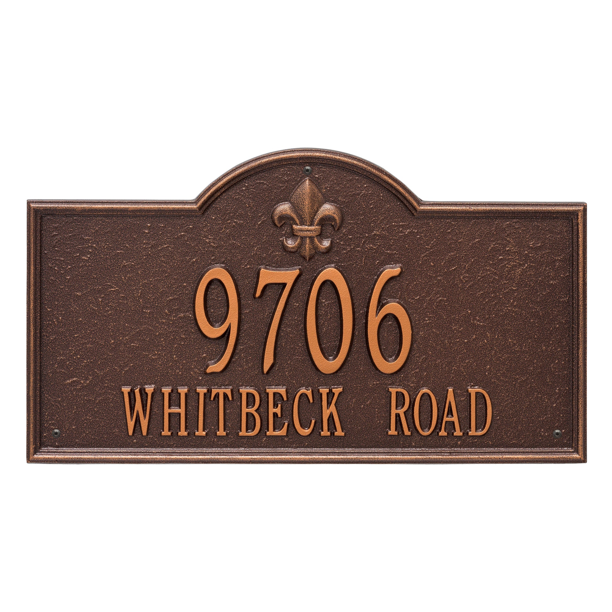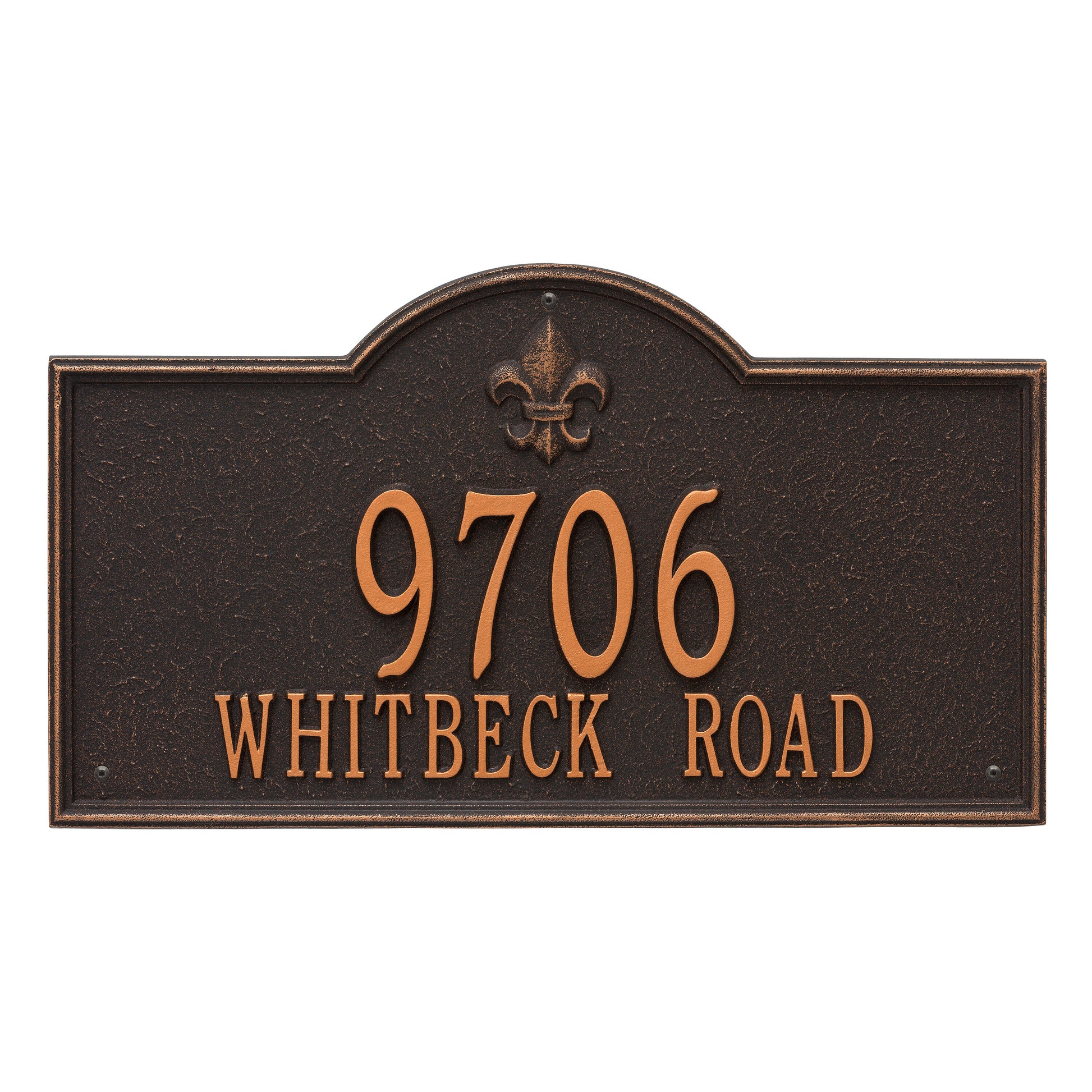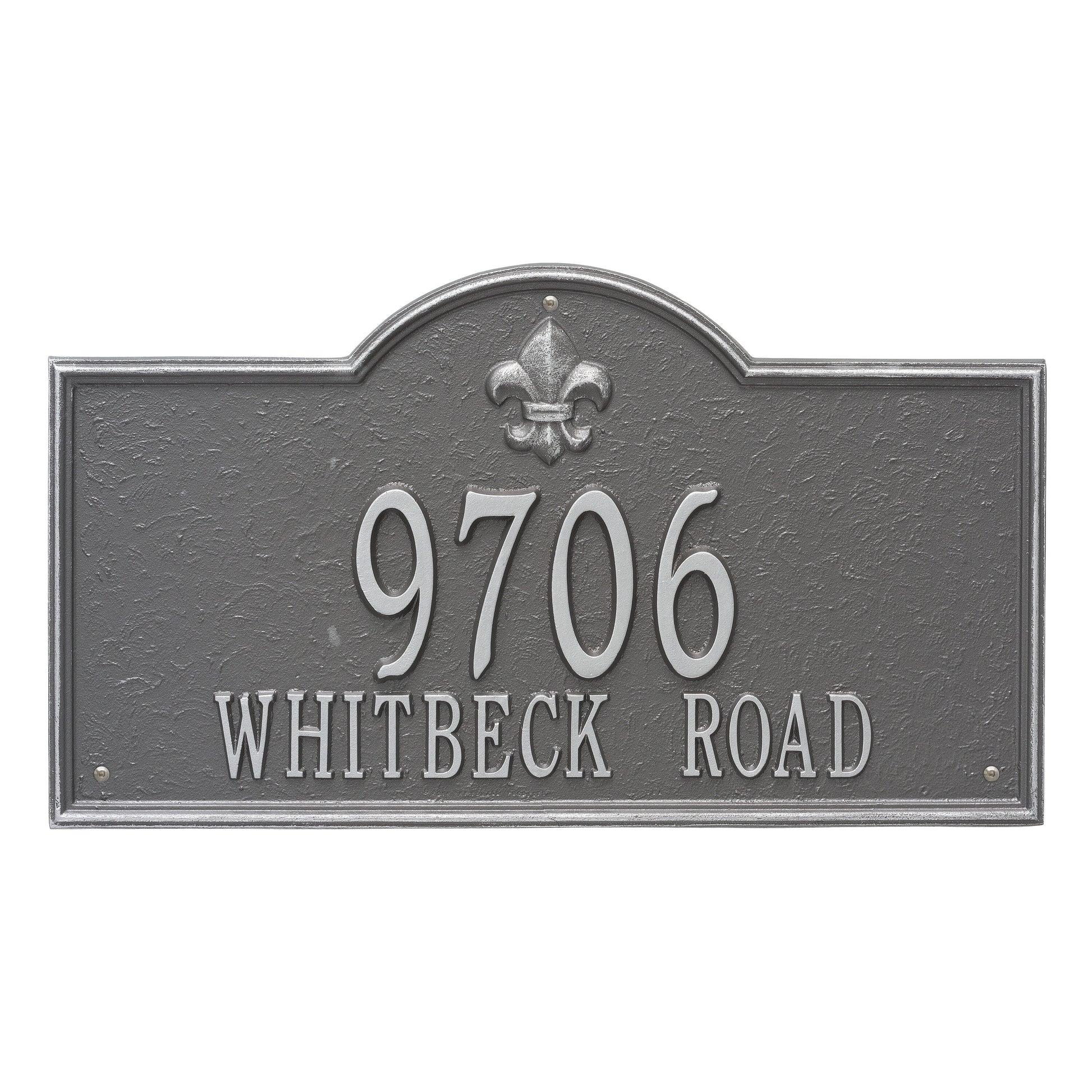 The Bayou Vista - Estate Wall - Two Line Address Plaque is proudly manufactured in the USA using premium, weather-resistant cast aluminum, ensuring that your investment will withstand the test of time and the elements. This address sign undergoes a thorough finishing process, featuring a protective coating and permanently cast, raised lettering and fleur-de-lis emblem for exceptional readability and aesthetic appeal. Every detail of this address plaque has been carefully considered, from the texture of the finish to the pre-drilled holes for easy installation on your home's exterior wall.